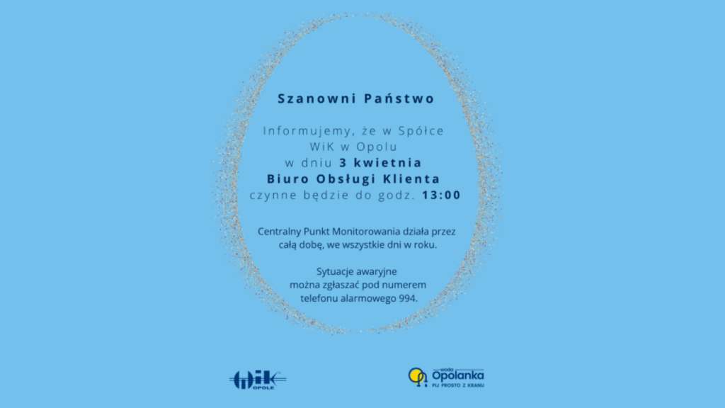 03 kwietnia Biuro Obsługi Klienta czynne do godz. 13:00 Szanowni Państwo Spółka Wodociągi i Kanalizacja w Opolu informuje, że w