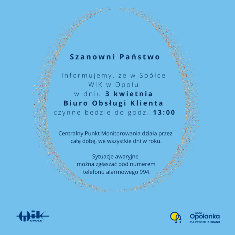Spółka Wodociągi i Kanalizacja w Opolu informuje, że w dniu 03 kwietnia 2026 r. Biuro Obsługi Klienta będzie czynne do godz. 13:00. Centralny Punkt Monitorowania niezmiennie pozostaje do Państwa dyspozycji codziennie przez całą dobę – tel. 77 443 55 49, e-mail: cpm@wikopole.com.pl. Wszelkie sytuacje alarmowe i awaryjne można także zgłaszać pod nr tel. 994.