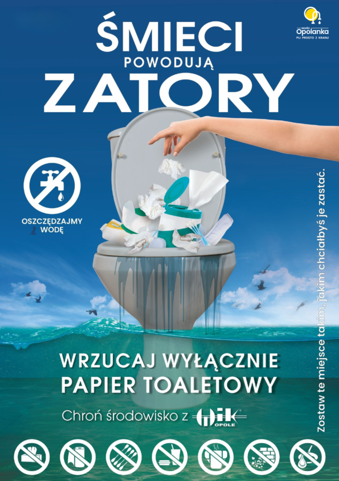 • Ręczniki papierowe, chusteczki nawilżane, pieluchy, tampony, patyczki i płatki kosmetyczne, nici dentystyczne wykonane są z tkaniny, która nie rozpuszcza się w wodzie, pęcznieje i nie ulega rozdrobnieniu. W efekcie prowadzą do zatkania odpływu toalety, pionów kanalizacyjnych oraz poważnie zakłócają procesy technologiczne oczyszczania ścieków. Zapychają oraz blokują urządzenia w sieci, doprowadzając do ich unieruchomienia i uszkodzenia. Przenikają do trudno dostępnych części pomp i maszyn, stanowiąc jedną z najczęstszych przyczyn awarii na terenie opolskich przepompowni.