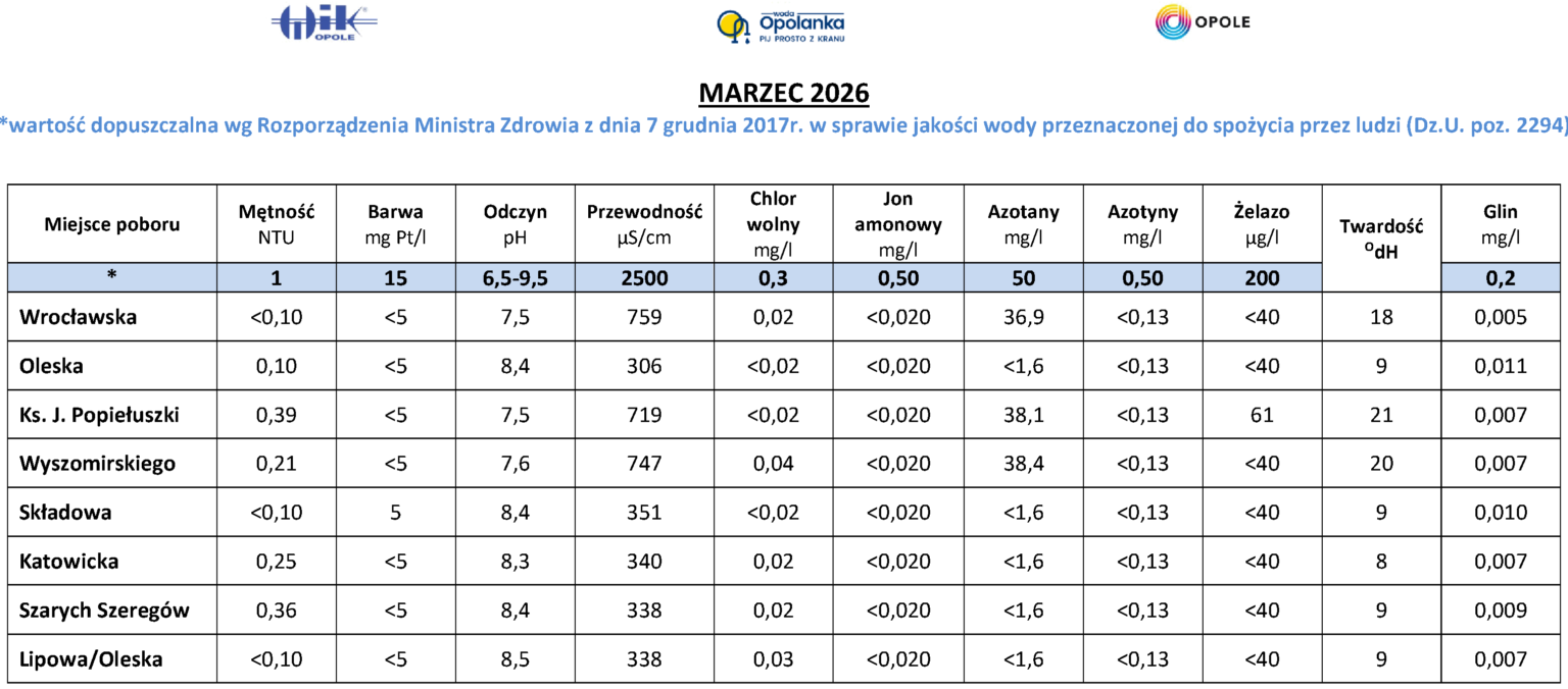 Badania jakości wody prowadzone są w trybie ciągłym – dzięki czemu mamy pewność, że Woda Opolanka jest bezpieczna i możliwie najlepszej jakości. Aktualizowane wyniki udostępniane poniżej do pobrania i zapoznania, stanowią podsumowanie analiz z punktów zgodności na terenie sieci wodociągowej miasta Opola w danym miesiącu. Zobacz: Ocena jakości wody Powiatowego Inspektora Sanitarnego w Opolu (II kwartał 2024)